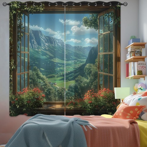 Mountain Blackout Curtains for Girls Boys Teens Home Decor, Spring Sky View Nature Forest Flower Grommet Thermal Insulated Drapes Darkening Window Curtain for Bedroom Living Room, 63 x 63 Inch