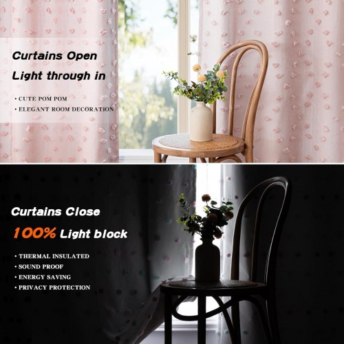 MYSKY HOME 100% Blackout Curtains for Girls Bedroom 90 Inch Long Total Room Darkening Curtain for Living Room 2 Panels Grommet Light Blocking Sliding Door Drapes Blush Pink Pom Pom Sheer 52″ x 90″