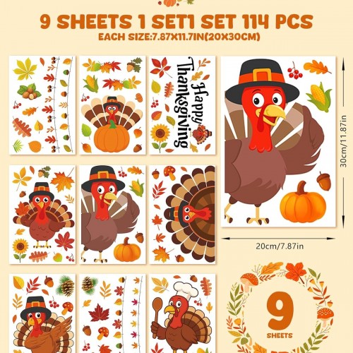 Thanksgiving Window Clings – 9 Sheets 114 Pcs Thanksgiving Decorations for Fall Autumn Harvest Home Party, Pumpkin Leaves Turkey Acorns Stickers for Glass, Double-Sided Static Window Decals